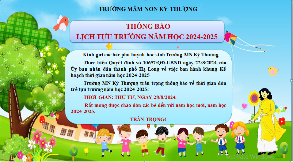 Trường mầm non Kỳ Thượng xin trân trọng thông báo lịch khai giảng năm học 2024-2025: Thời gian: 8h00, ngày